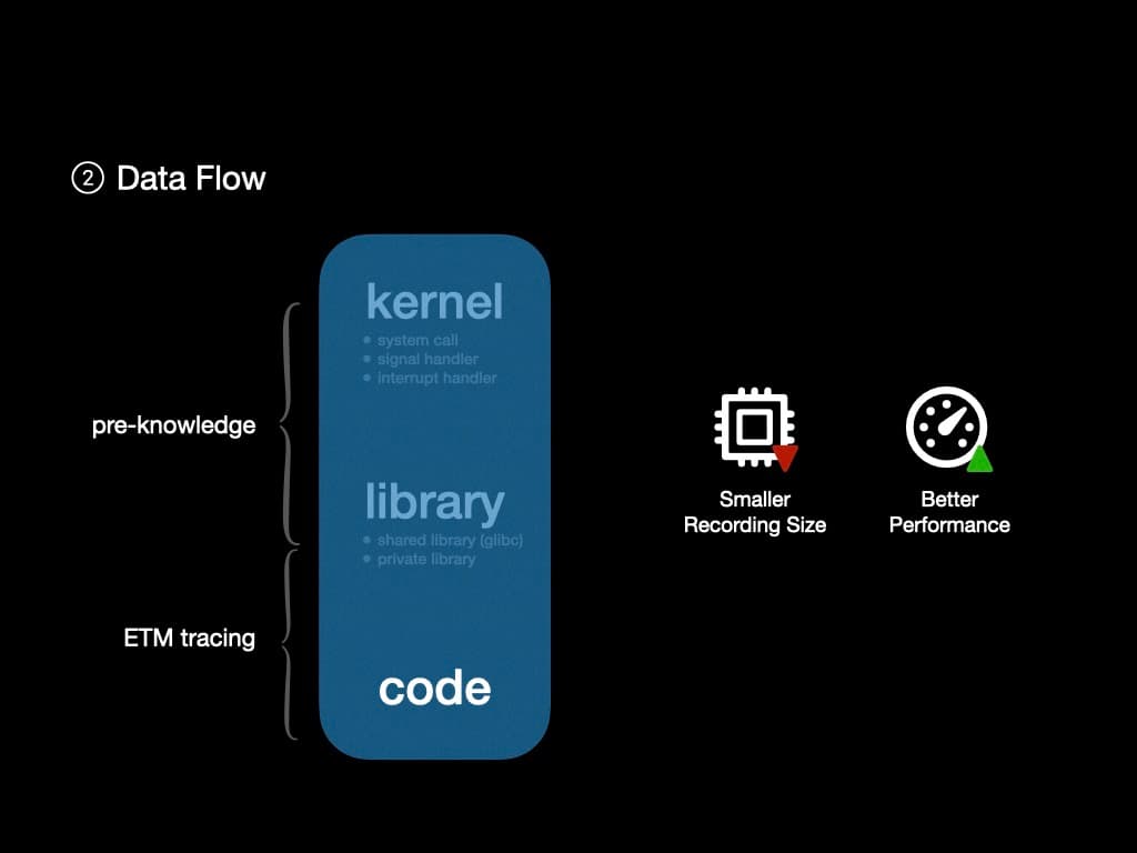 The next challenge is to build the data flow. Since ETM can trace every instruction executed in the CPU, it should be fine to rerun the control flow to get the data flow. However, using ETM to trace kernel and shared library is a kind of waste.