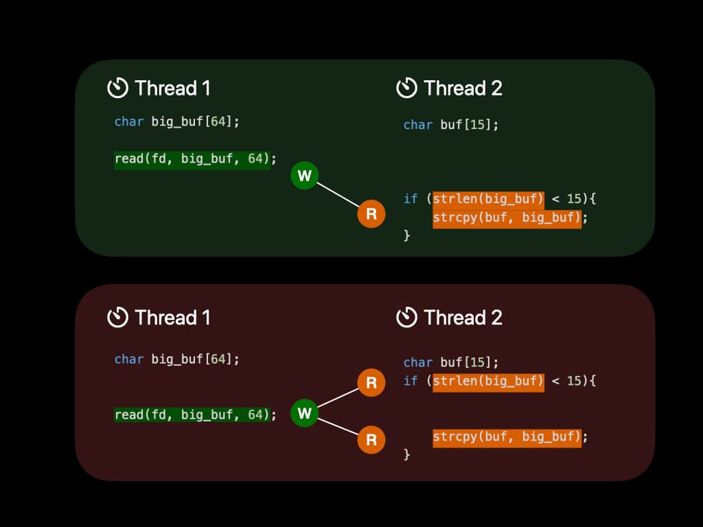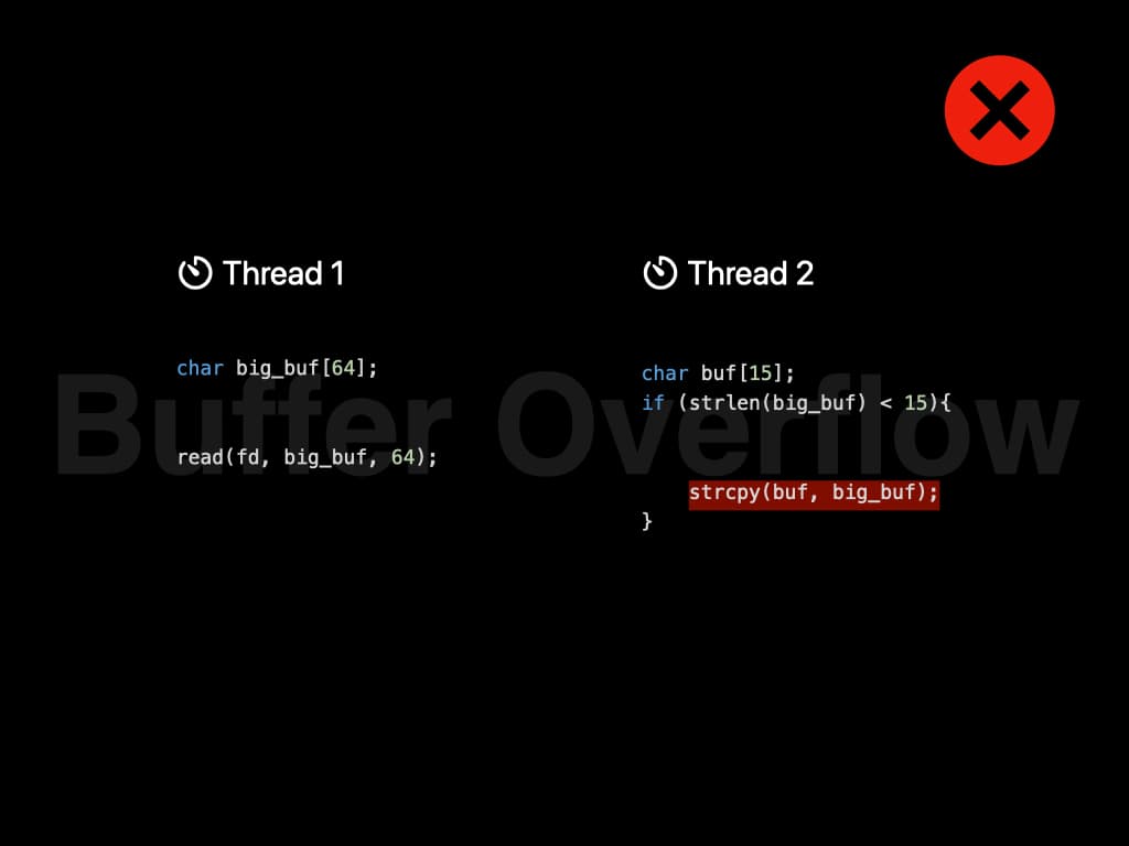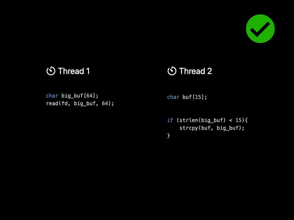 However, the scheduling of threads is controlled by Operating System. Since the two threads don't have any kind of locks, it might be executed in this order: Length checking is performed before reading. And string copy is performed after reading. Now the string copy is dangerous since it introduces a buffer overflow. The content in the file might overwrite the runtime stack, and that is a serious security risk.