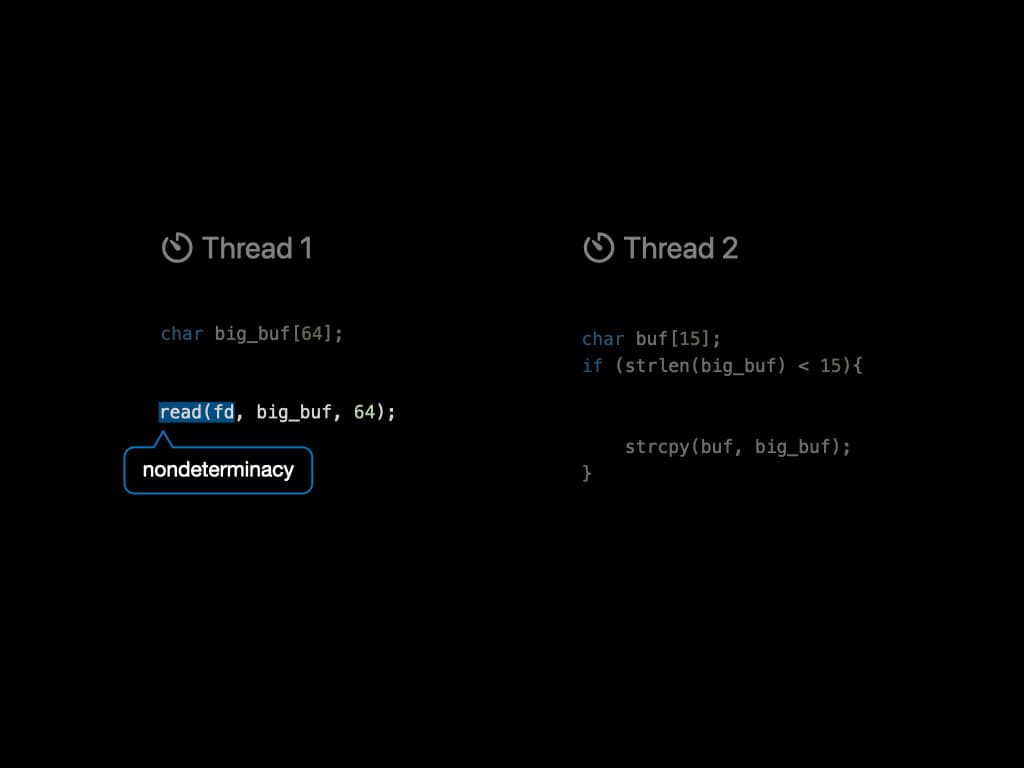 There is another key fact in the example. Thread 1 tries to read content from a file descriptor. What if the content itself has a length smaller than 15? Then there will be no bugs! The input to a program will affect its behavior. The system call read()