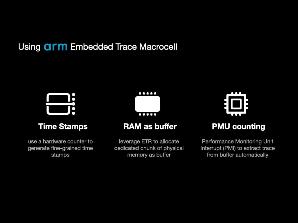 The amazing hardware which helps us to trace execution is called arm Embedded Trace Macrocell (ETM). If you are familiar with Intel Processor Trace (Intel PT), you may find that these two hardware provides the same functionality.