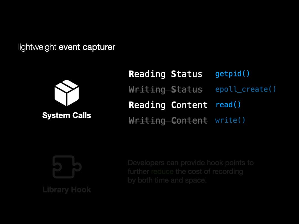 Instead of tracing the full execution, we implement a lightweight event capturer to record system calls, exceptions, signals and interrupts.