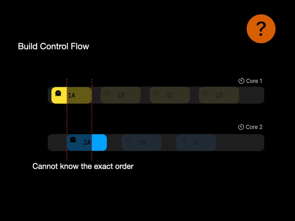 For example, the time stamp might not be precise enougth to give the exact order of execution. In this example, there is an overlap between 1A and 2A. Thus we might lose the information about data race. This problem is still a puzzle among researchers.