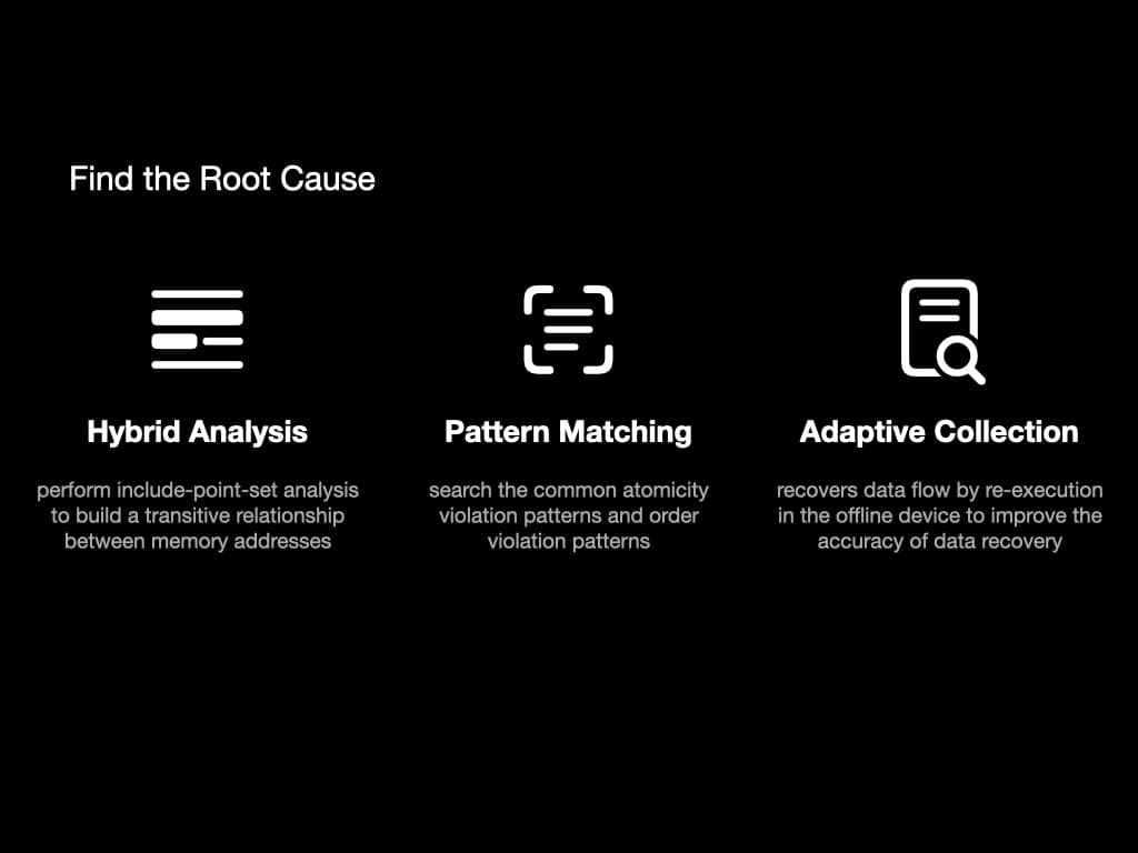 After a program failure, we then have the control flow and data flow. To find the root cause of the failure, we use these methods: hybrid analysis, pattern matching, and adaptive collection.