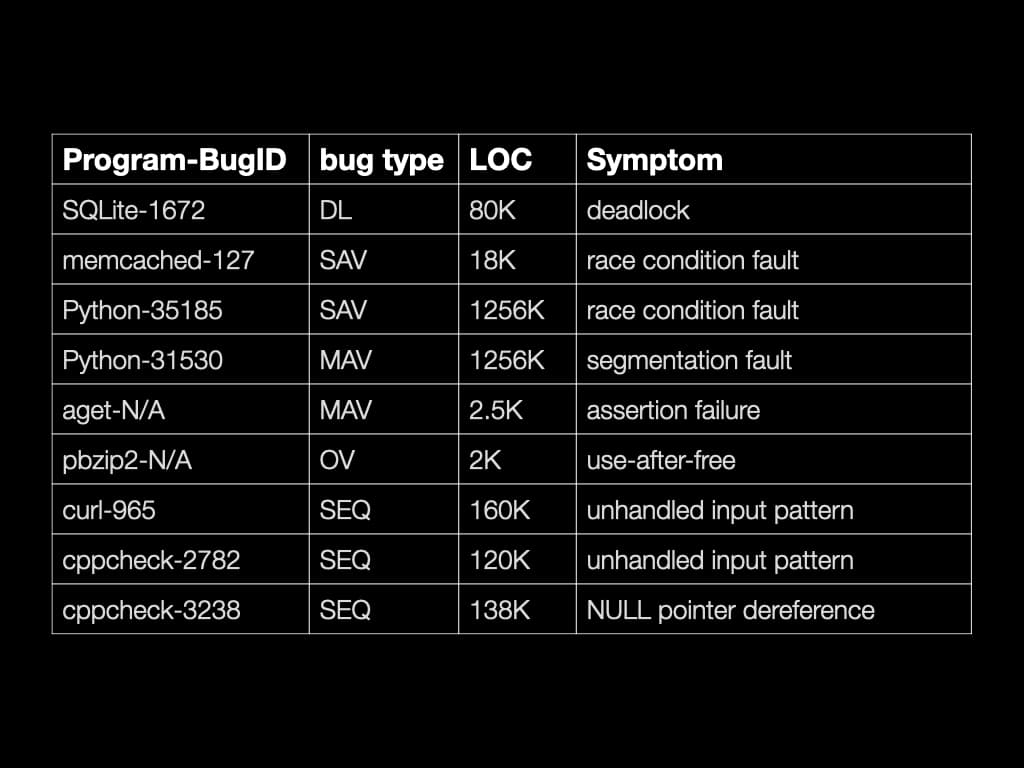 Investigator is able to find the root cause of many famous concurrency bugs. It is also able to find the root cause of some non-concurrency bugs.