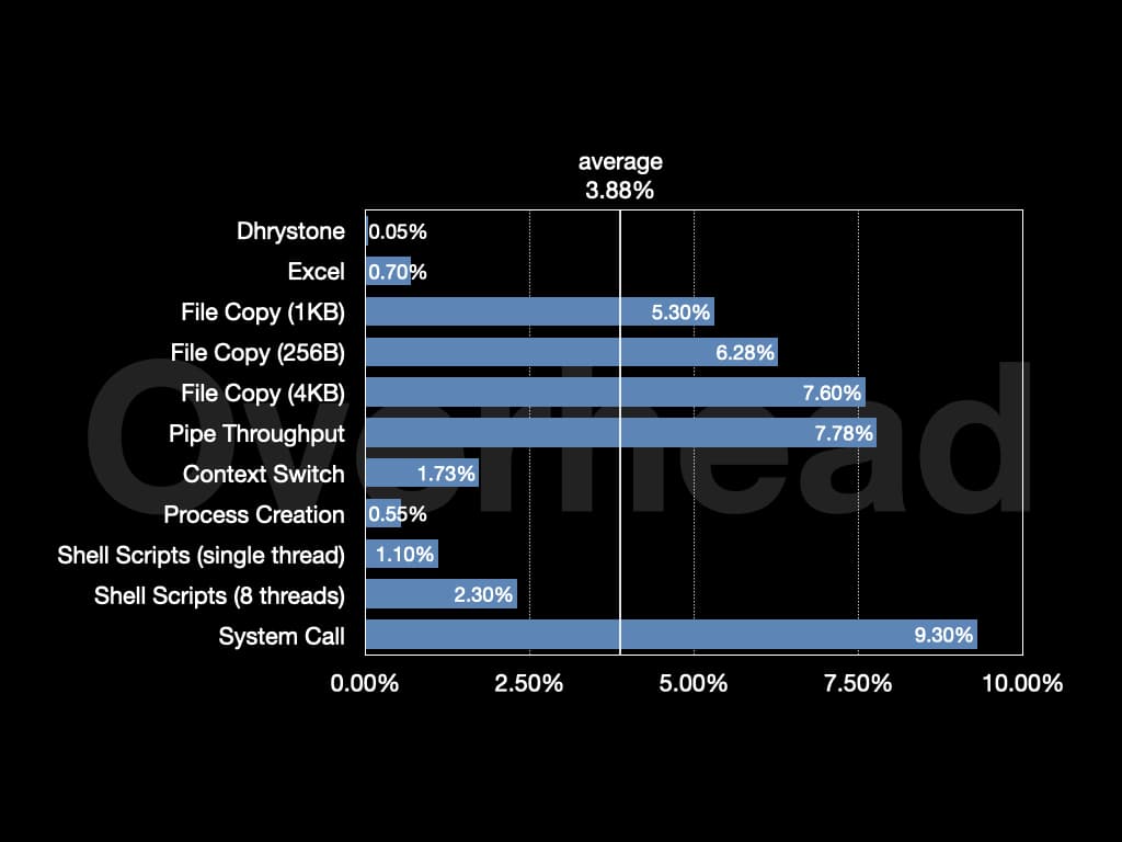 The overall overhead is around 4% on Unixbench. On Nginx, the overhead is around 1.3%.