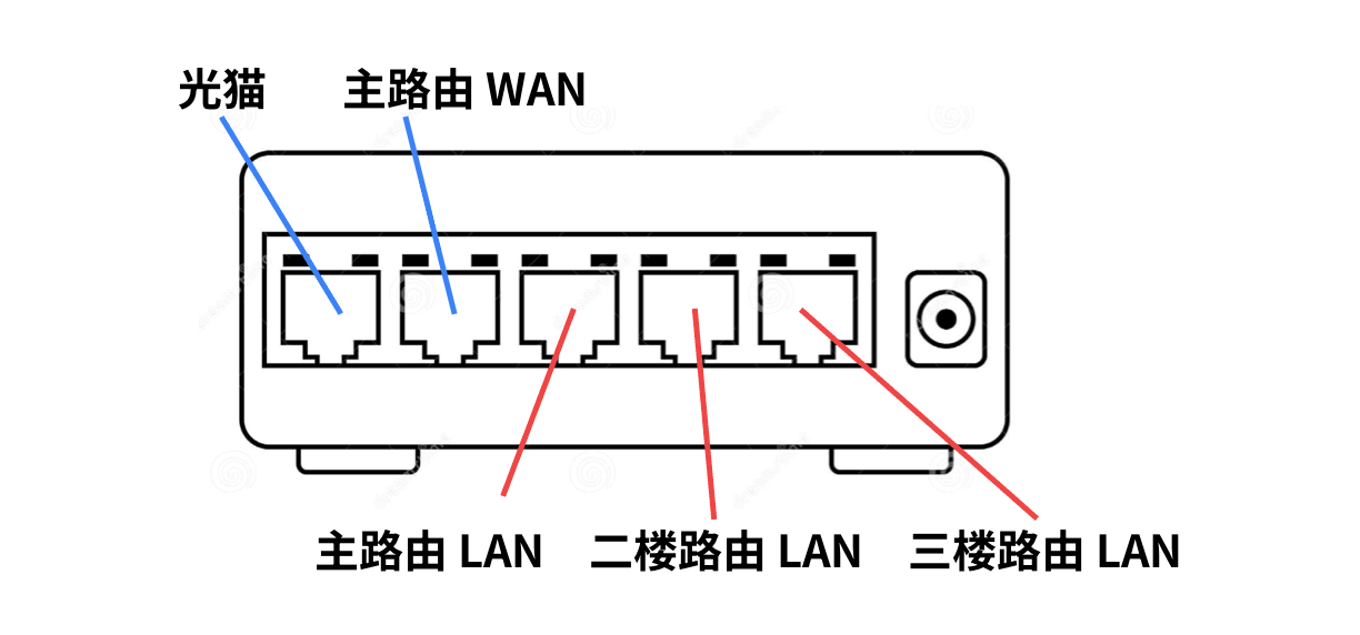 我们不妨把目光重新移到上面 “有线回程” 那张图上。主路由不能拖在弱电箱外面,那也许可以放在一楼,利用墙里的线作为 [光猫 - WAN] 的连接线。可是,[LAN - 交换机] 的这条线咋整?墙里只有一根线啊?