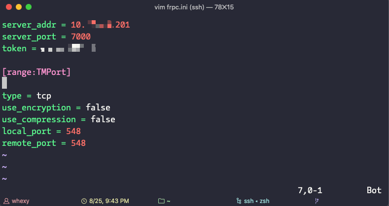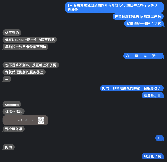 AFP 功能需要开放端口 548。这时候问题来了:这台虚拟机的宿主机是 macOS 系统,macOS 默认占用了 548 端口。一开始准备通过分配虚拟网卡的方式直接解决,但是由于学长水平太差认为不可行,这个方案也失败了。在我一度准备放弃的时候,他提出了四个字 —— 内 网 穿 透!