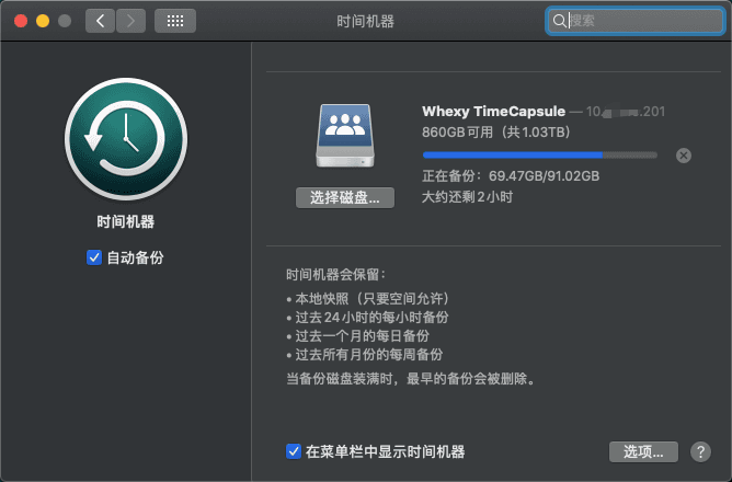 学校宿舍区的 AP 速度非常慢(宿舍区 --> 智园)。第一次备份花了整整 6 个小时。但是搭建完这个服务之后,只要 MacBook 连在学校内网里,就会每隔一小时自动备份。这些备份是无感的,每次花费若干秒。
